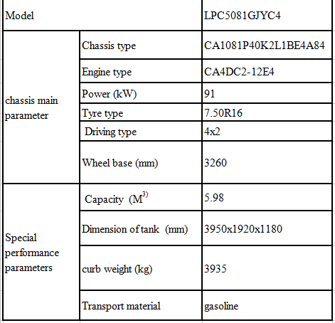 | 主要結(jié)構(gòu) | 罐體使用優(yōu)質(zhì)鋼板、采用梯形結(jié)構(gòu),旋壓弧形封頭。 罐體全部采用自動焊接成型。 罐底安裝有一個4寸海底閥,罐體尾部設有緊急切斷閥。 罐體上部設置一個人孔蓋。 罐頂設圍框,罐后帶扶梯。 罐體側(cè)邊設置軟管筒,用于存放卸料管。 按國家標準安裝側(cè)防護、尾防護、后防護及示廓、示廓、轉(zhuǎn)向等燈具。 | |